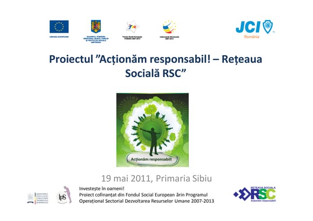 In octombrie 2010, Federatia Junior Chamber International (JCI) Romania, împreuna cu partenerii sai Ministerul Educatiei, Cercetarii, Tineretului si Sportului si Asociatia Institutul pentru Politici Sociale au initiat proiectul „Actionam responsabil! – Reteaua sociala RSC”, co-finantat din Programul Operational Sectorial pentru Dezvoltarea Resurselor Umane 2007 – 2013.